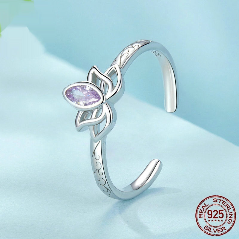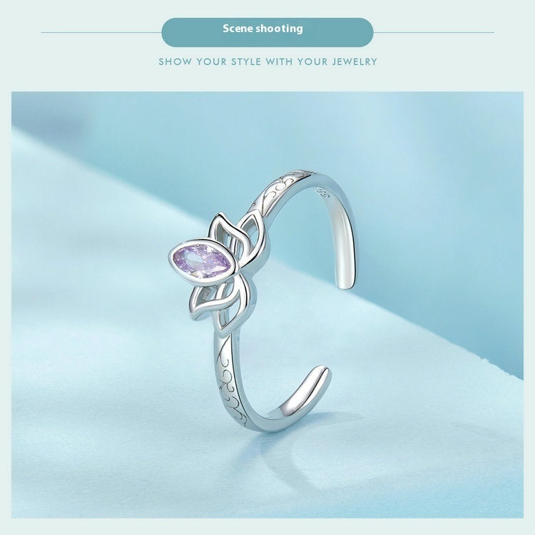 At its center rests a delicately set zircon stone, shaped and polished according to 3A zircon-cut standards—its sparkle echoing the radiance of a fine diamond. Surrounding the stone, the lotus silhouette unfolds in elegant curves, symbolizing purity rising above life’s currents.