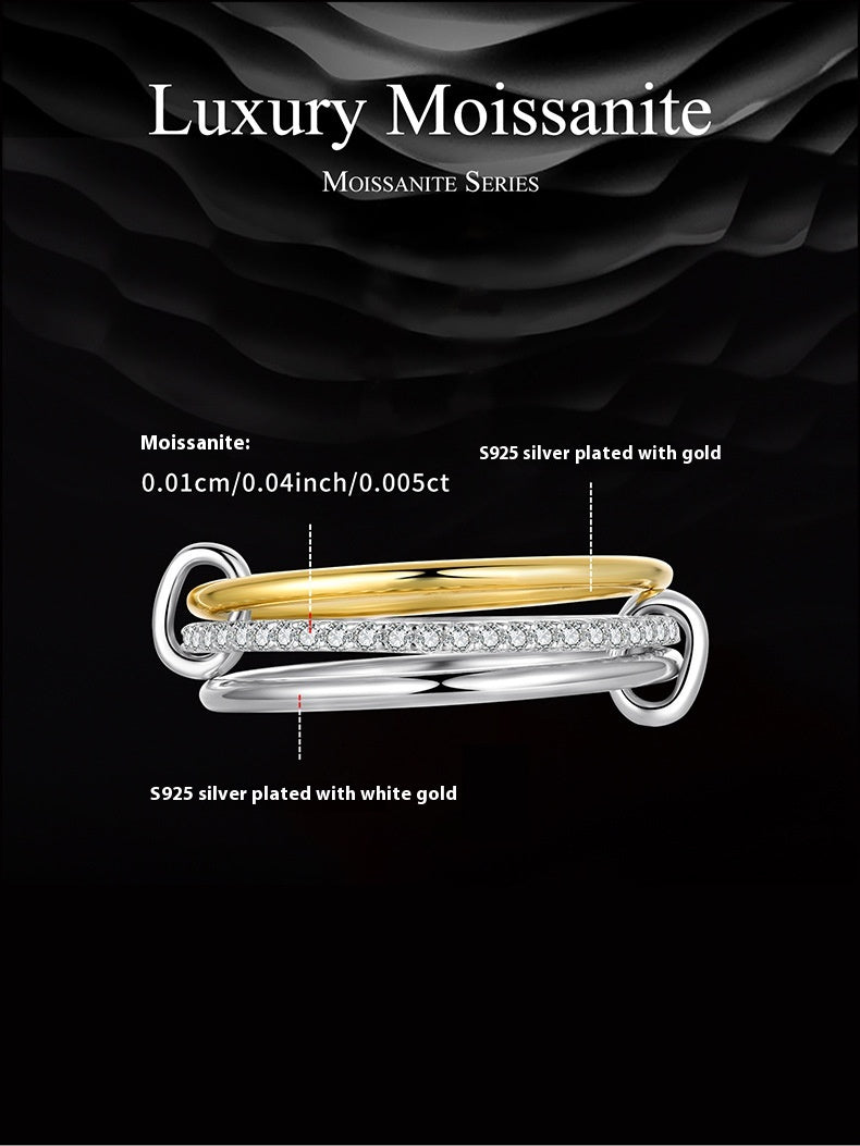 The ring features three interlocking bands — one in radiant gold, one in sleek platinum silver, and one delicately adorned with Moissanite. Together, they create a beautifully balanced composition that represents unity, sophistication, and effortless style. Each tiny stone is meticulously set to catch and reflect the light, giving the ring a graceful sparkle without being overly flashy.